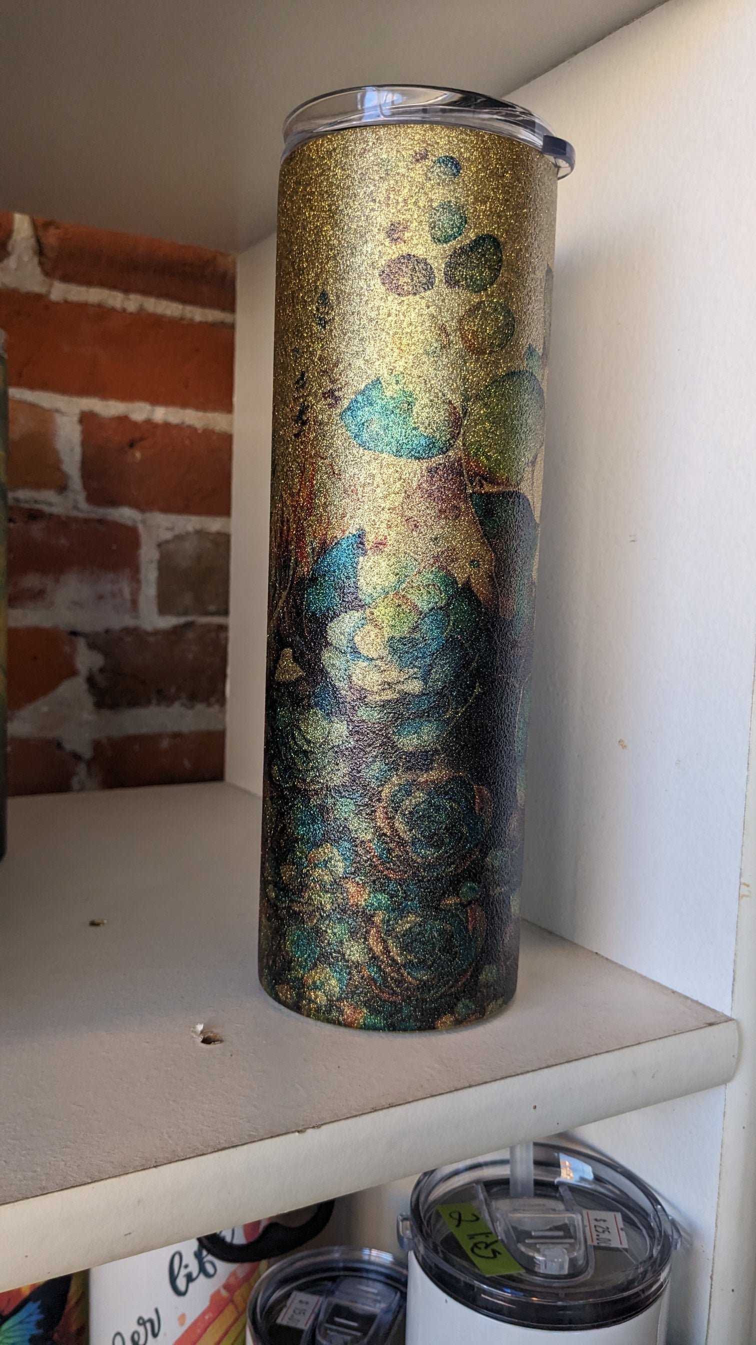This is a 30 oz insulated stainless steel tumbler coated in glitter the image is sublimated on the Tumbler. Avoid extreme heat and hand washing is recommended