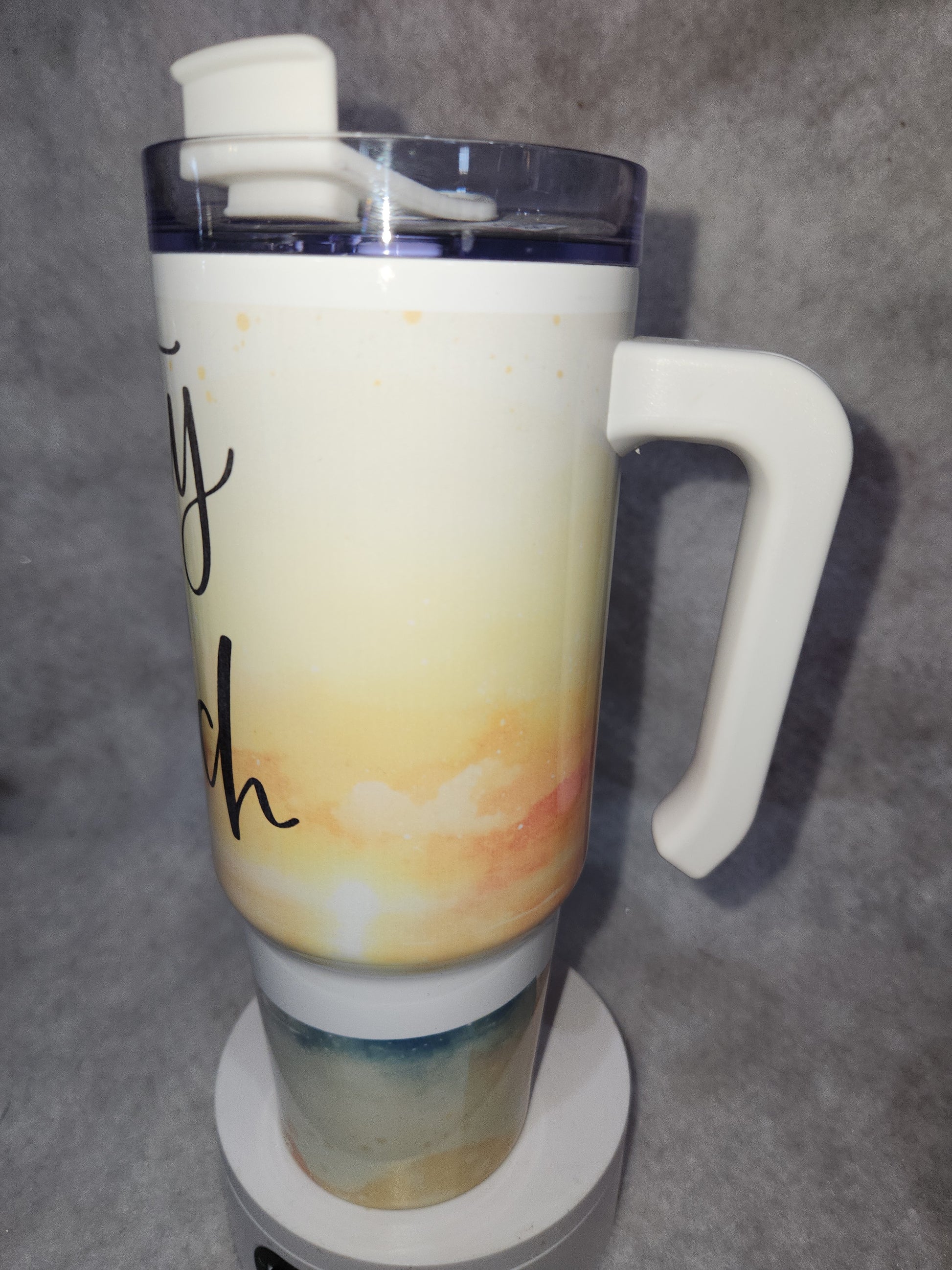 This is a 30 oz stainless steel insulated tumbler the bottom will fit most drink holders in vehicles it has a stainless steel straw with a brush cleaner. The handles are very nice soft rubber. The image is sublimated on the Tumbler therefore avoid extreme heat and hand washing is recommended. The design that I bought has some weird stripe patterns to the left of salty as a beach and there is one area on the bottom that doesn't match up quite right thus I have decreased the price. Please see photos as they are part of the description. We do not take returns on tumblers once out of our hands, due to the chance they could be dented, or top broken if it is dropped and the image may fade if you put in the dishwasher.