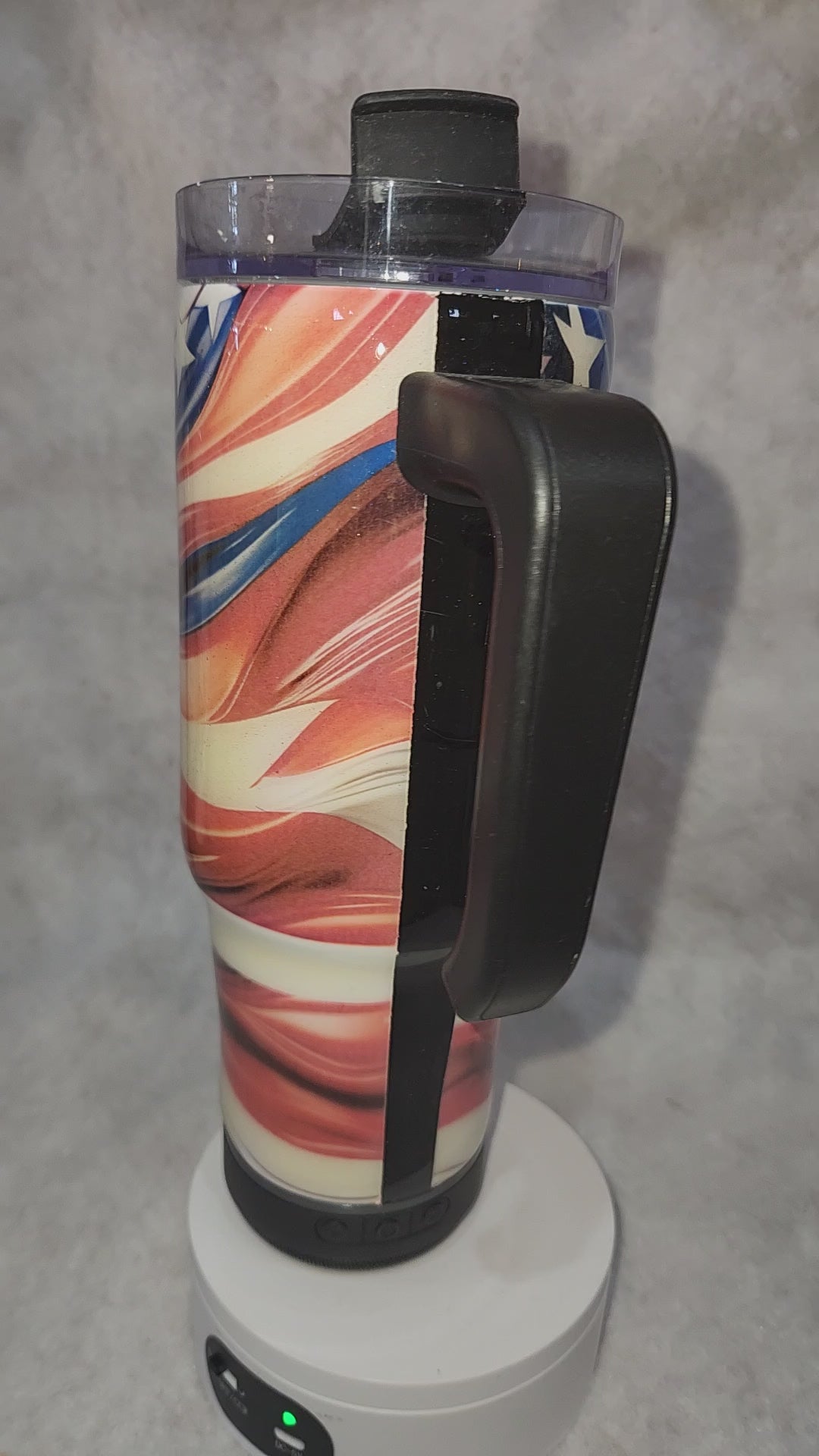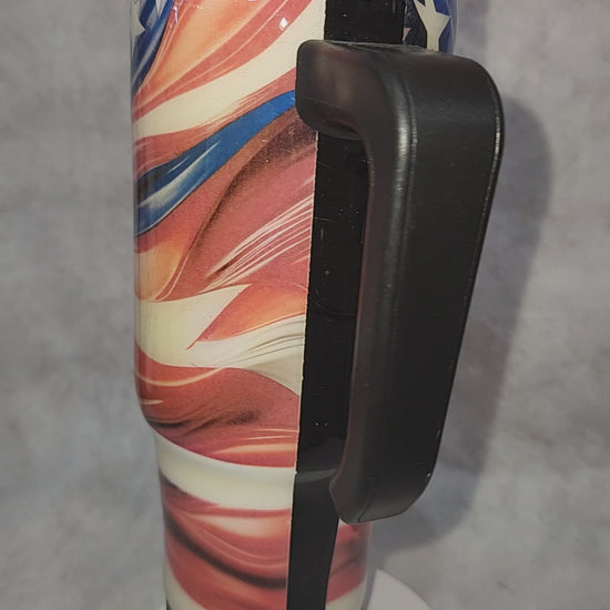 Black speaker black handle. It comes with cord for rechargeable speaker and a straw. Version of a US flag. It is also coated with epoxy. Please see photos as they are part of the description. We40 oz stainless steel, insulated tumbler. The bottom fits most vehicle drink holders. We do not take returns on tumblers once out of our hands, due to the chance they could be dented, or top broken if it is dropped and the image may fade if you put in the dishwasher.