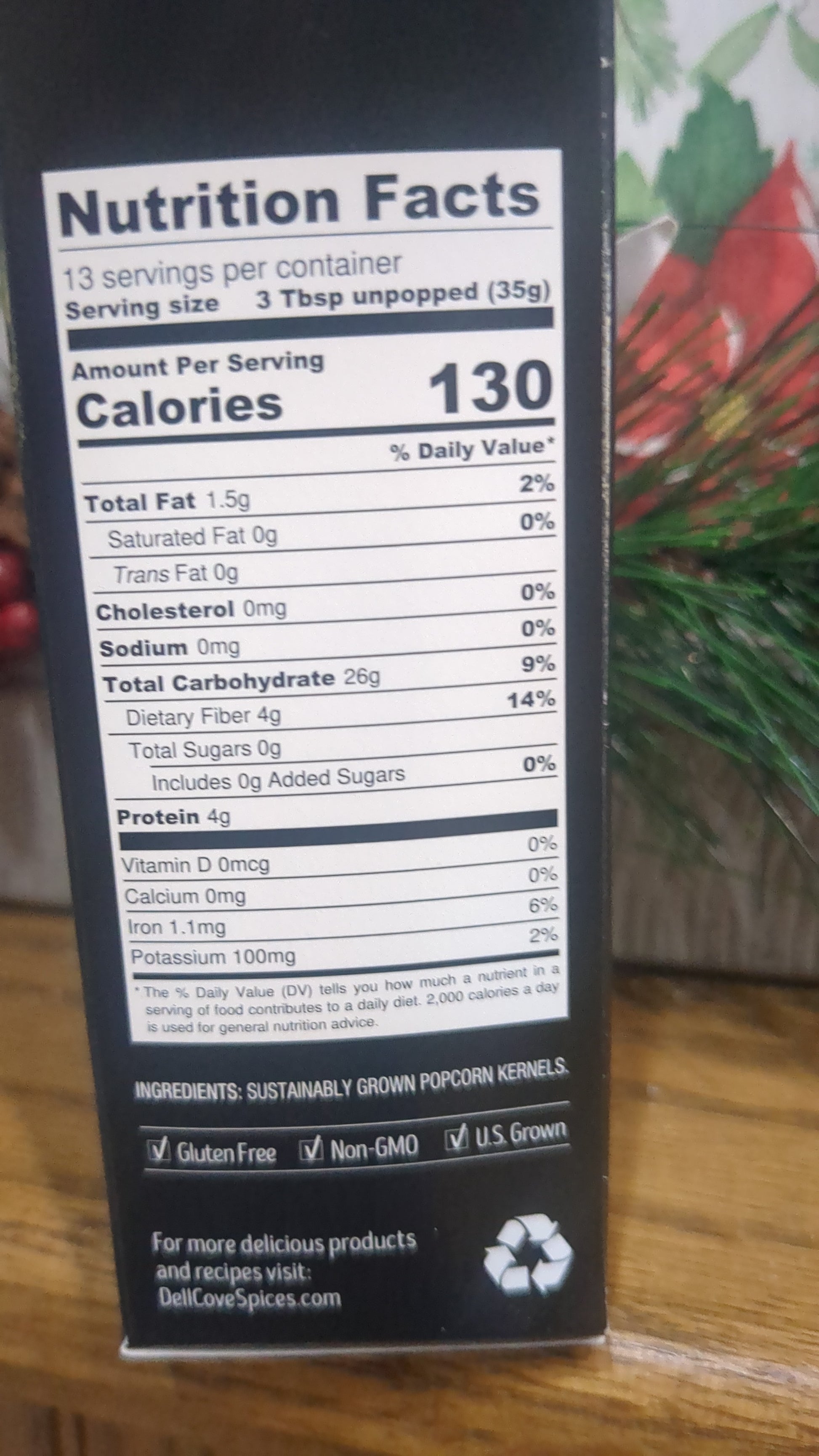 This popcorn naturally ranges in color from jet black to a blue black, and will look burnt when you pop them - but they're not! The box has a blank gift tag printed on one side, making it an easy, unique holiday gift.