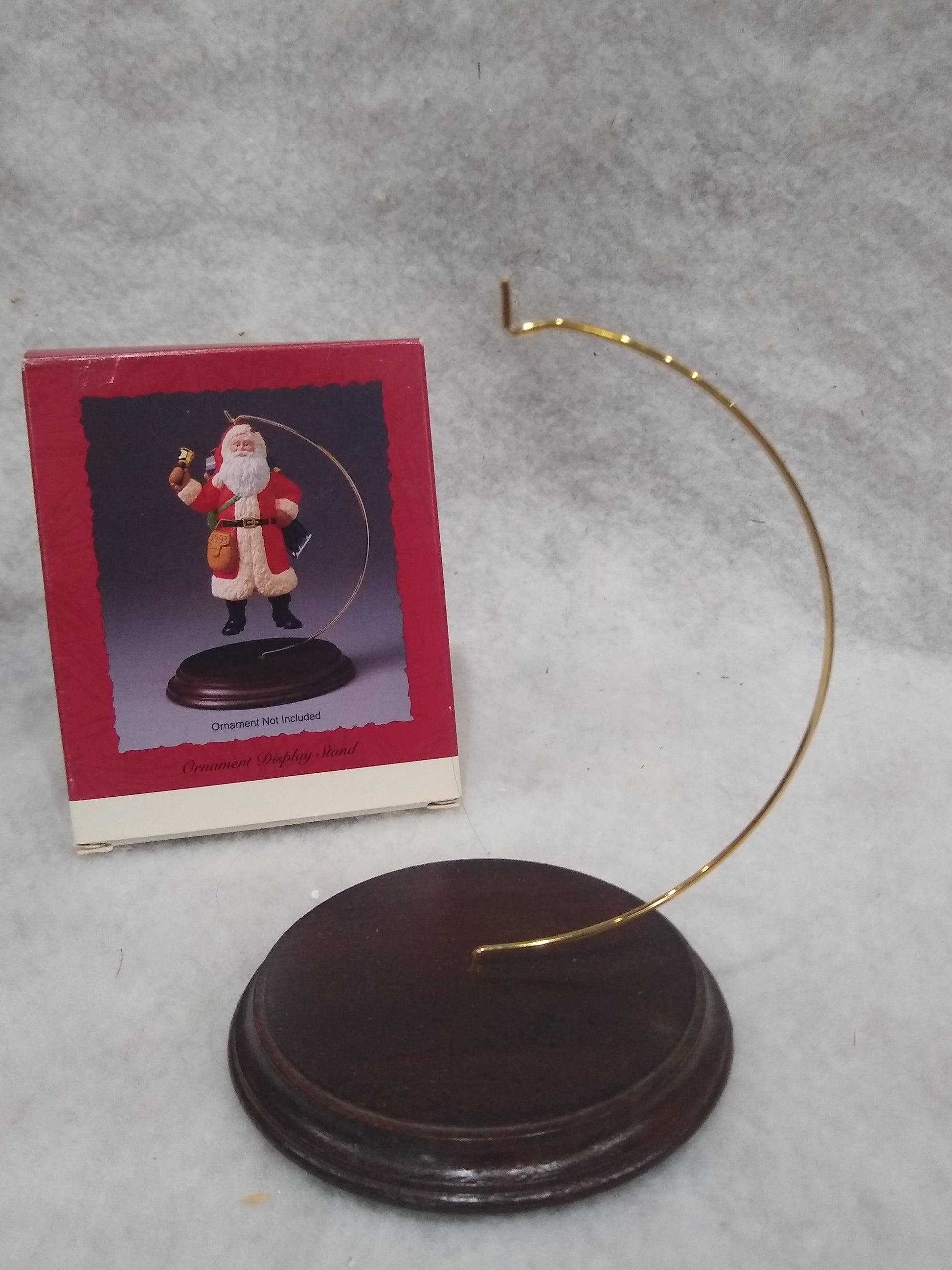 DOES NOT INCLUDE AN ORNAMENT. The stand is new in the box. it is a solid wood base and metal holder. Stand 5 1/2" tall. Distance from base to Hanger is just under 5" Great for displaying your favorite ornaments. Please see photos as they are part of the description.