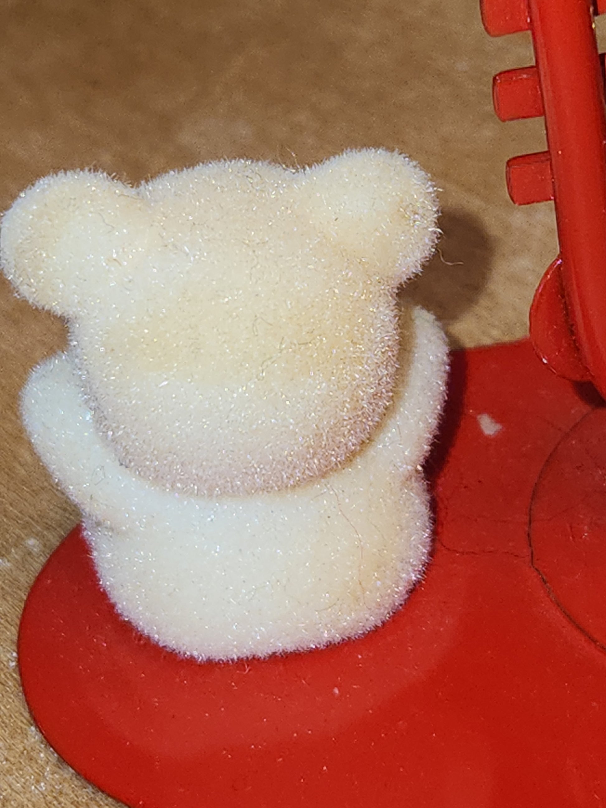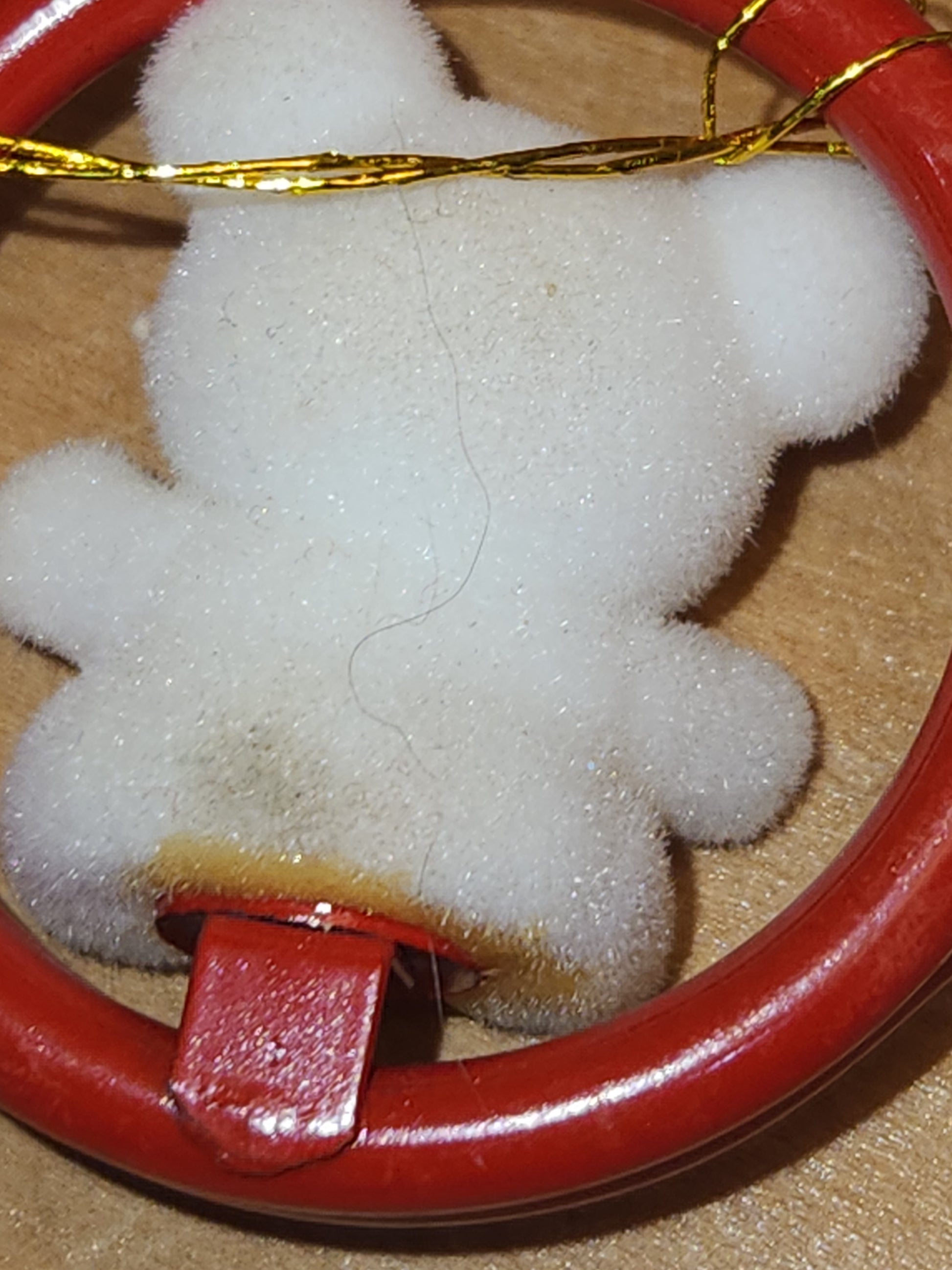 This is a set of 4 Avon Ornaments with Flocked Bears. Both bench Ornaments are in good condition and they are 3" wide and 2 1/4" tall. The Trumpet ornamanet is in good condition, the Bear has discoloration where it was glued. The teumpet is 2 1/4"" wide and almost 2 1/2" tall. The bear on the horn has discoloration and a stain on its back. The horn is 3 1/4" wide. Please see photos as they are part of the description