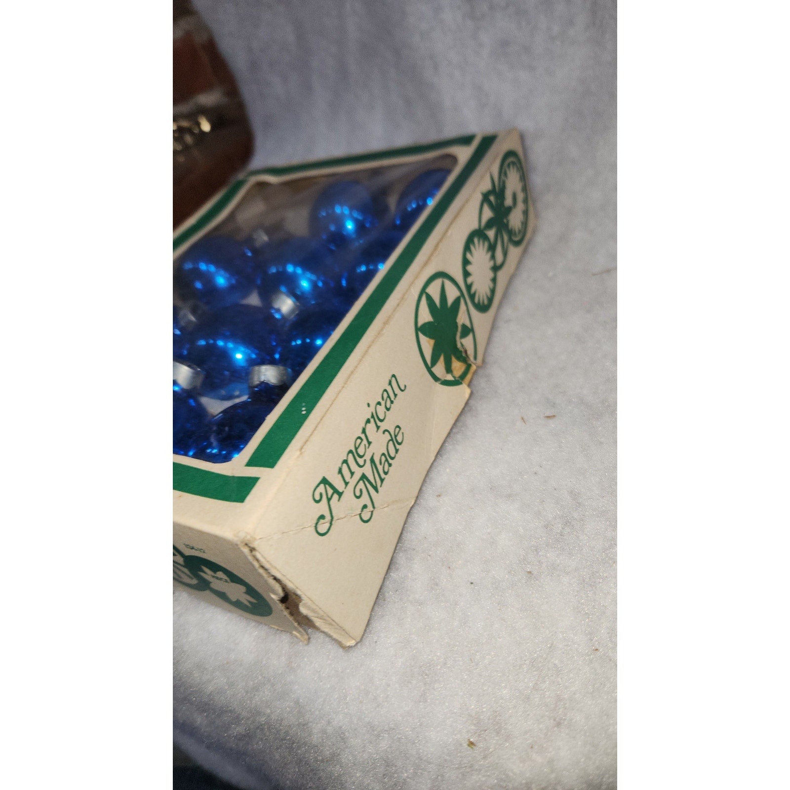 This is a box of blue ornaments. There are 2 missing from the box. I believe they may be made by Coby, but it does not say anything other than glass ornaments on the box. When buying vintage ornaments, you are buying orrnaments that have crazing, paint loss, faded paint, but we never send anything that's damaged. The box is in vintage condition, there is one rip at a corner. The film is intact, but a bit dirty.