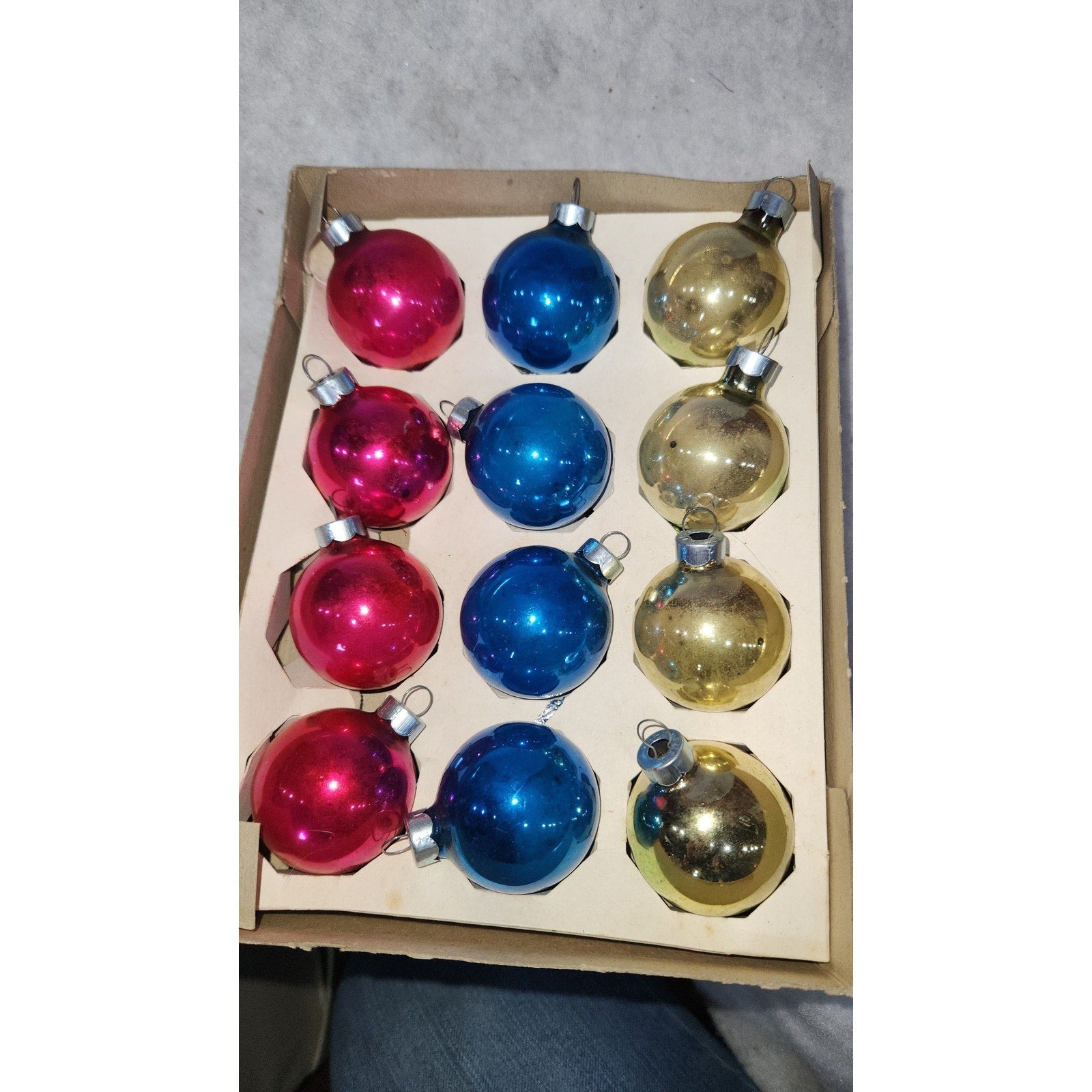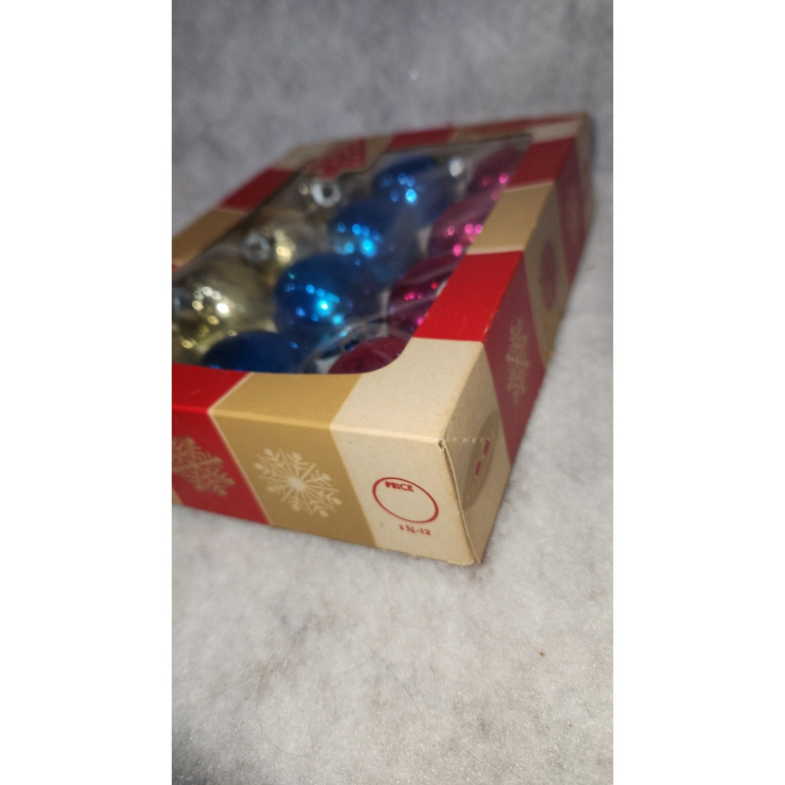 This is a box of glass ornaments by Coby. A bit over 1 1/2" Box is in vintage condition, the film has tape residue and is dirty. When buying vintage ornaments, you are buying crazing, paint loss and feed spots, we will not send anything with lots of damage or any broken. Please see photos as they are part of the description.