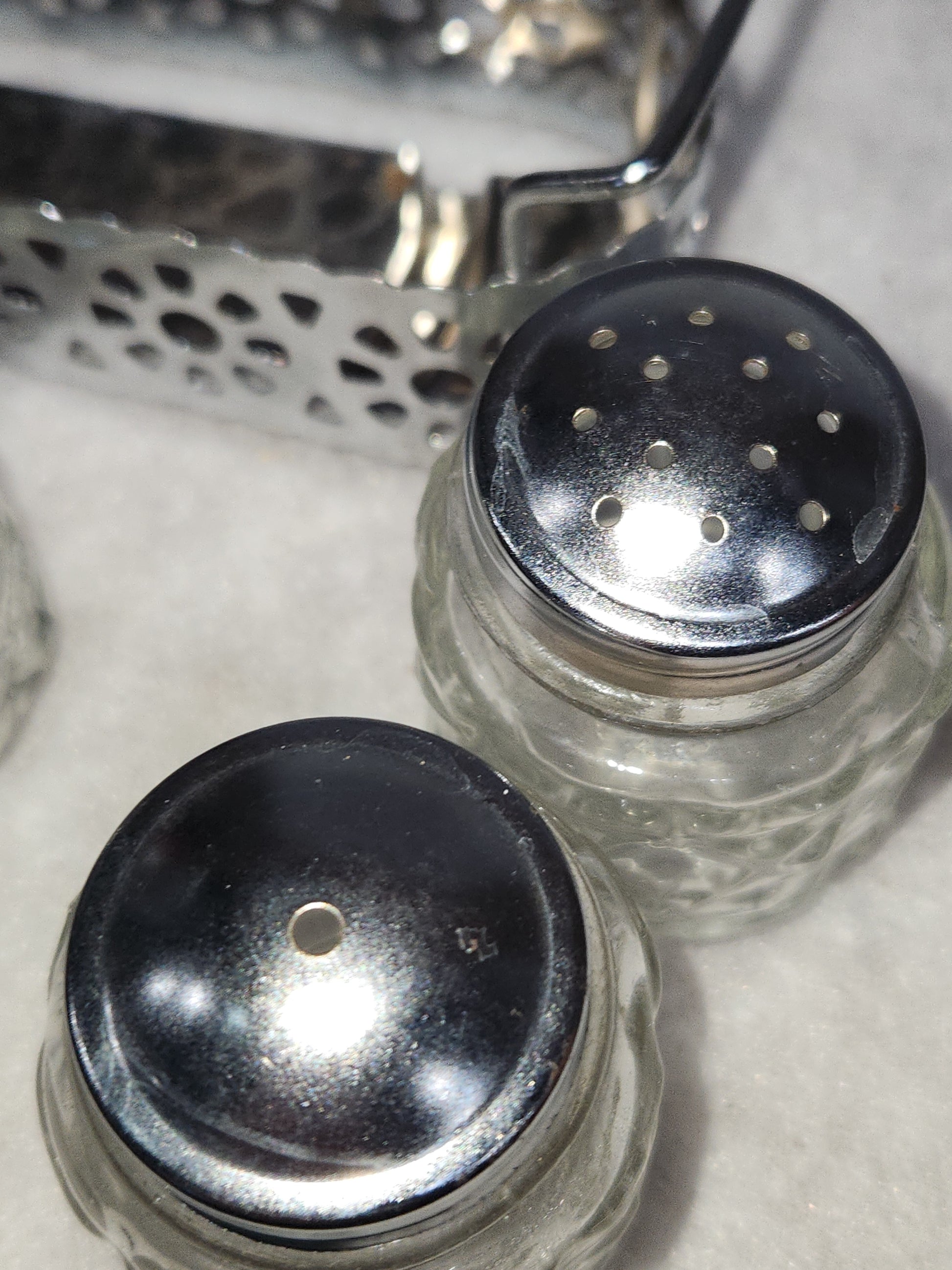 Vintage clear cut glass salt, pepper and condiment set in aluminum holder has tiny spoon sps24