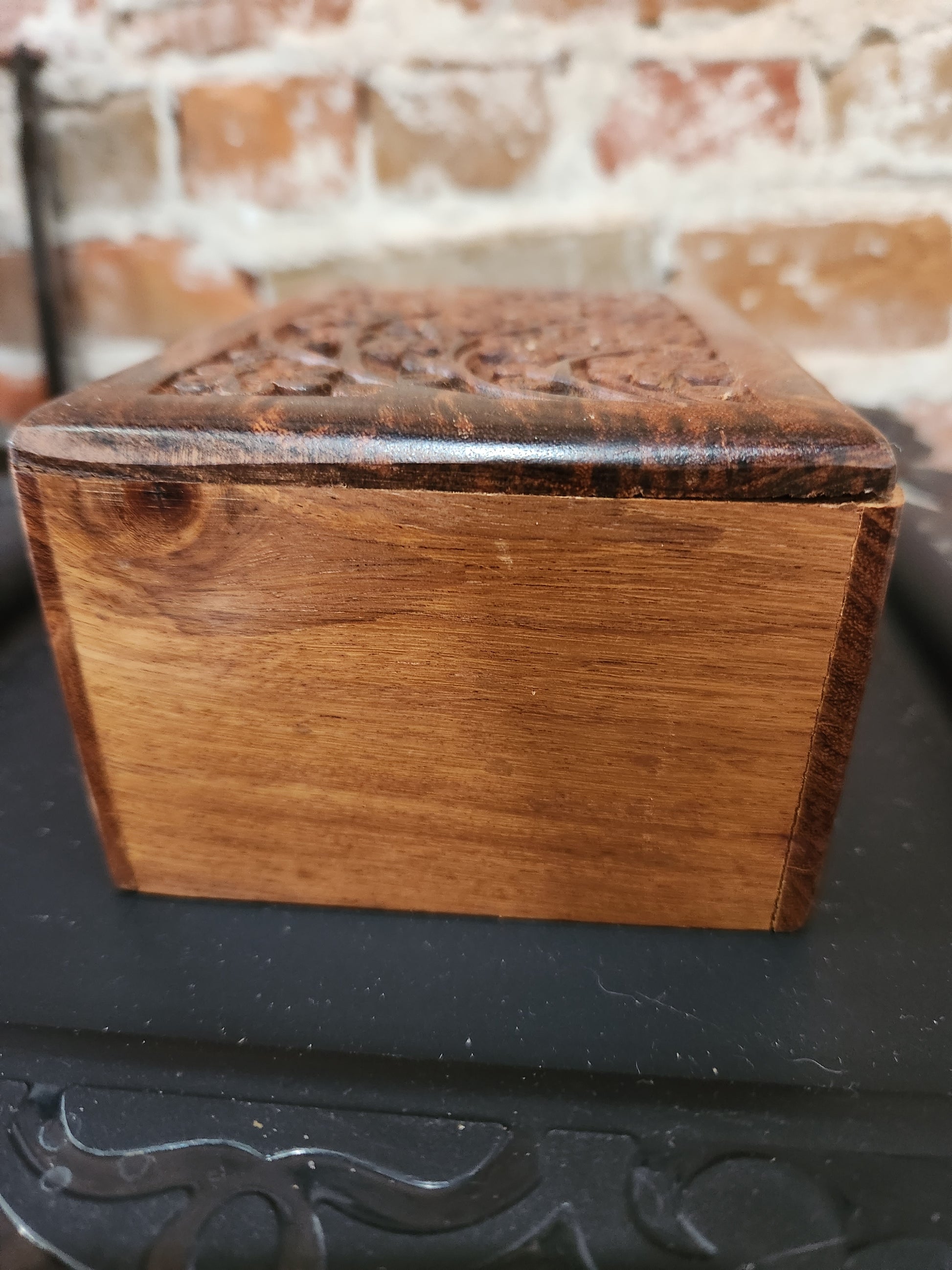 Vintage Hand Craved floral design on wooden box. Lid Opening on Bottom so it has a Hidden Compartment! Box in great used, vintage condition. Made in India