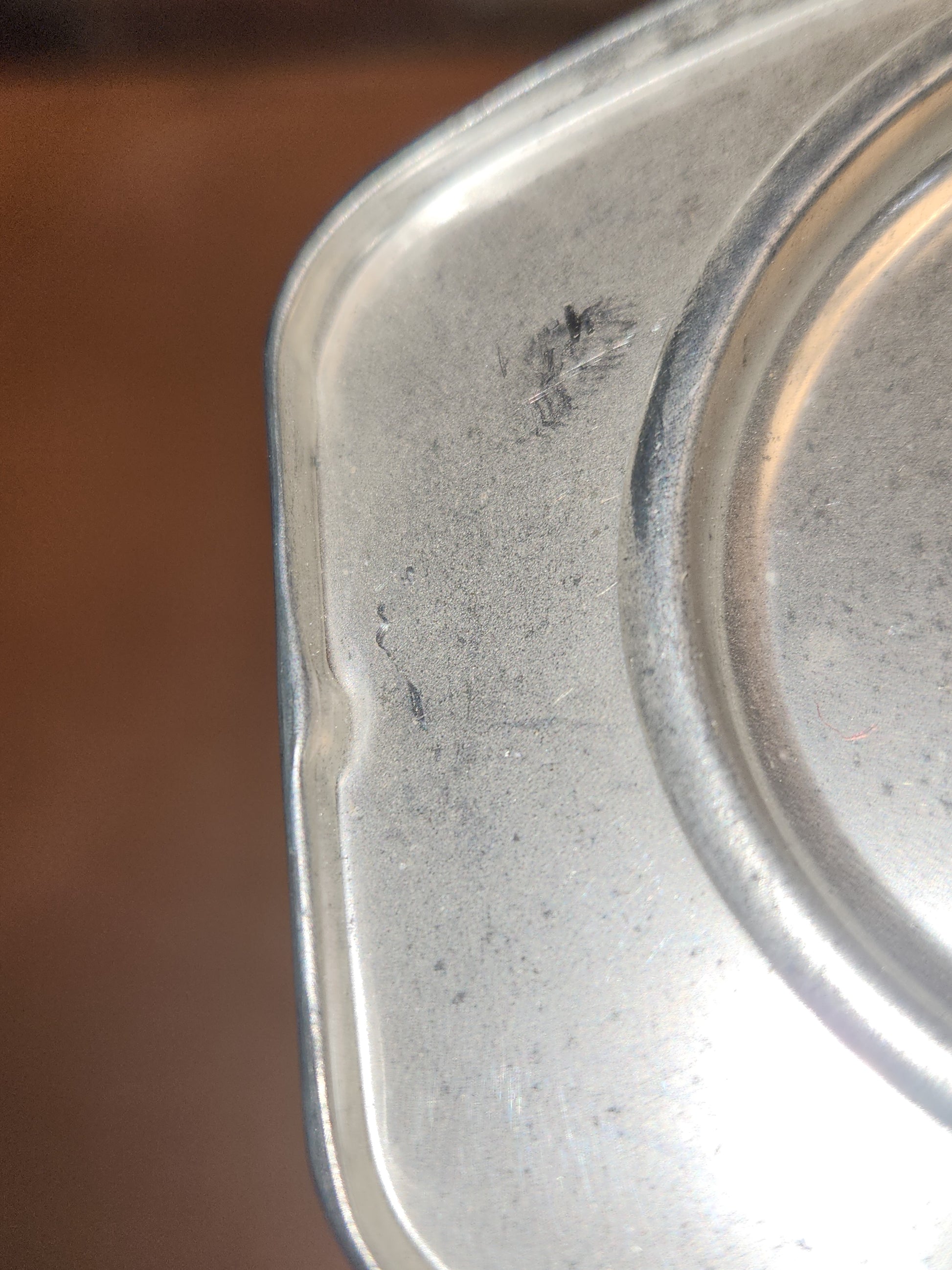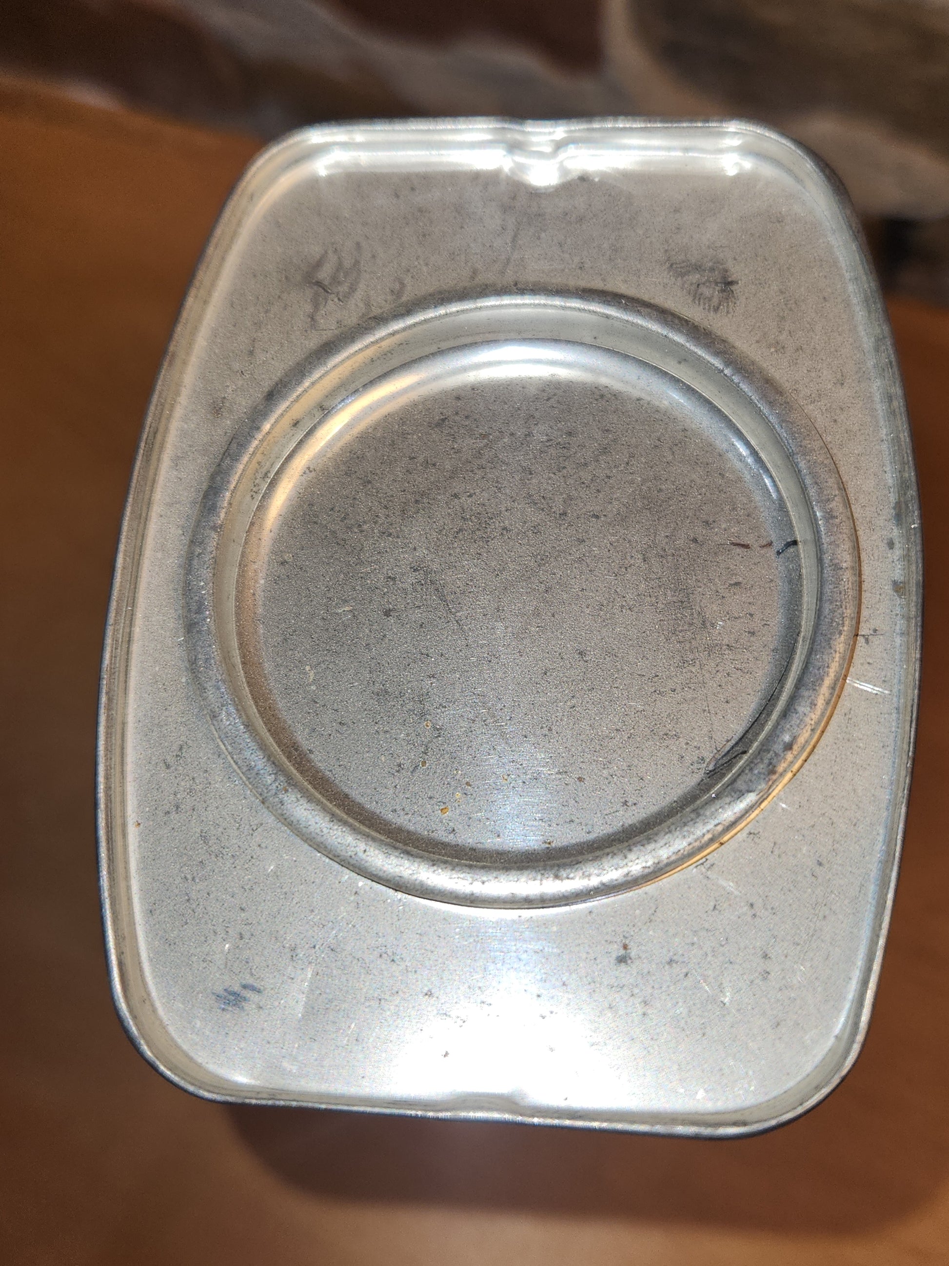 This tin is in good vintage condition. 5 1/2" tall it is 3 3/4" long and just under 3" wide. Please see photos as they are part of the description.