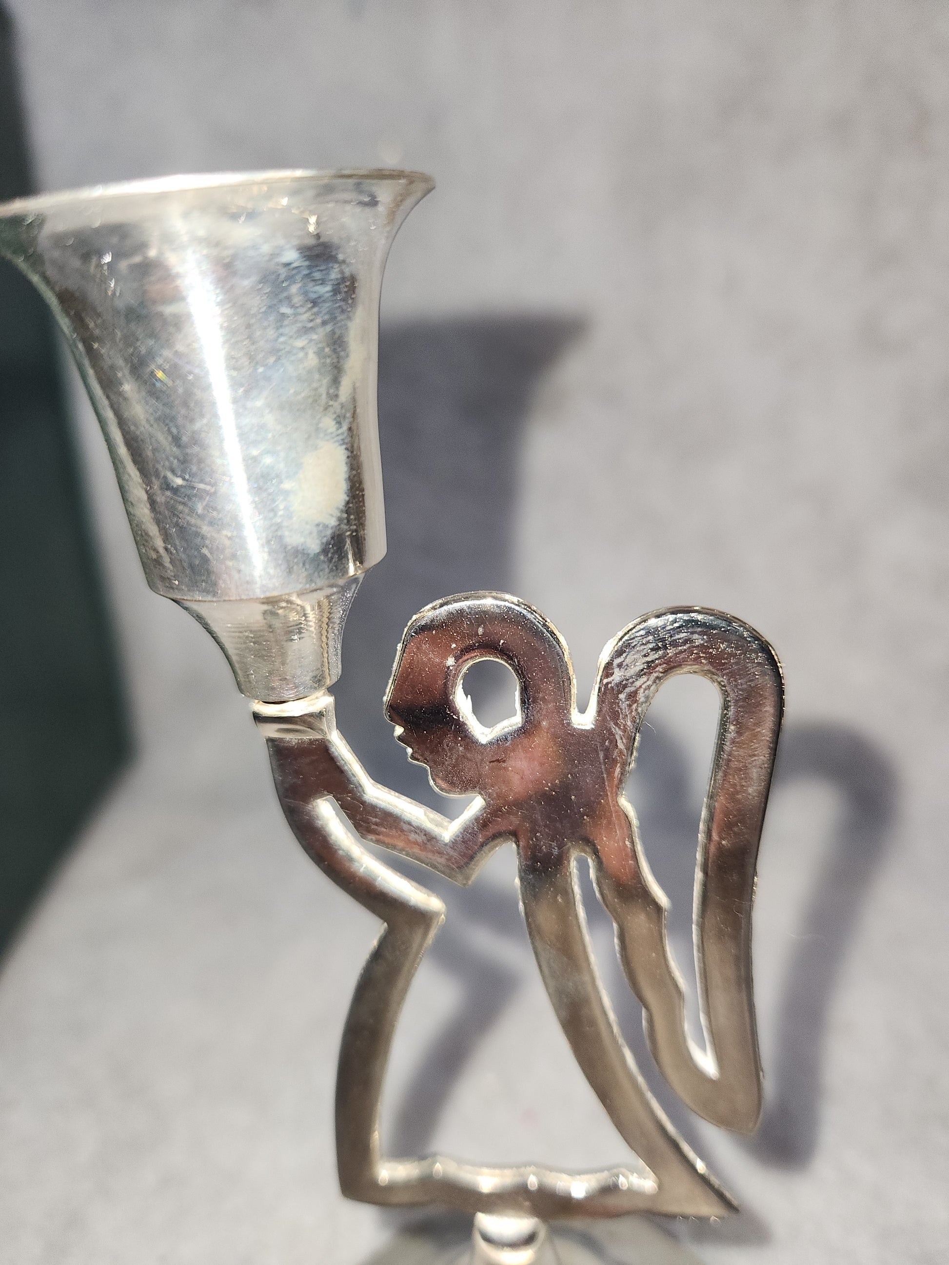This is a set of 3 angels in good condition. The tallest one is just over 7 1/4" the middle 6 3/4" and smallest is 5 3/4" They are in good condition with very little wear. Their original box is included with a little shelf wear. They have their stickers with says Internal Silver Co. Hand Made Silverplated India. If you didn't want to hold candles, place an ornament on top. Tip the ornament upside down so the top fits into candleholder. Please see photos as they are part of the description.