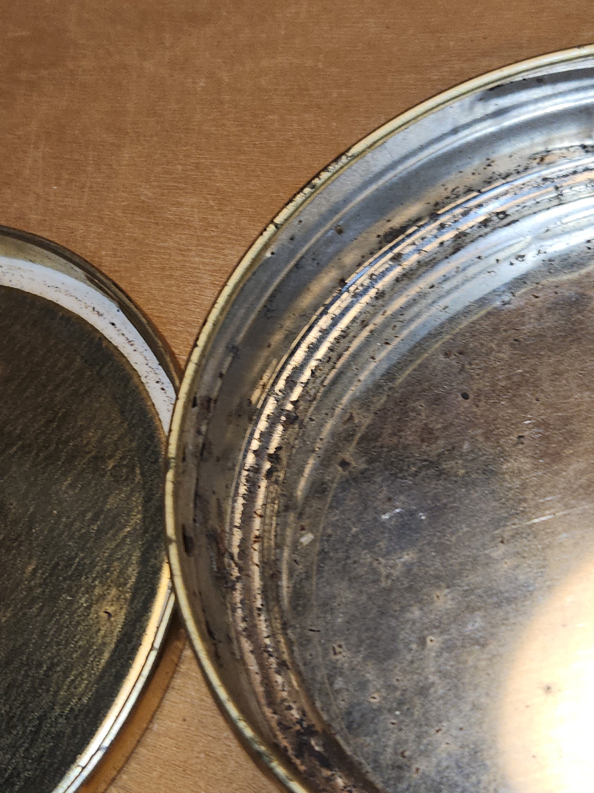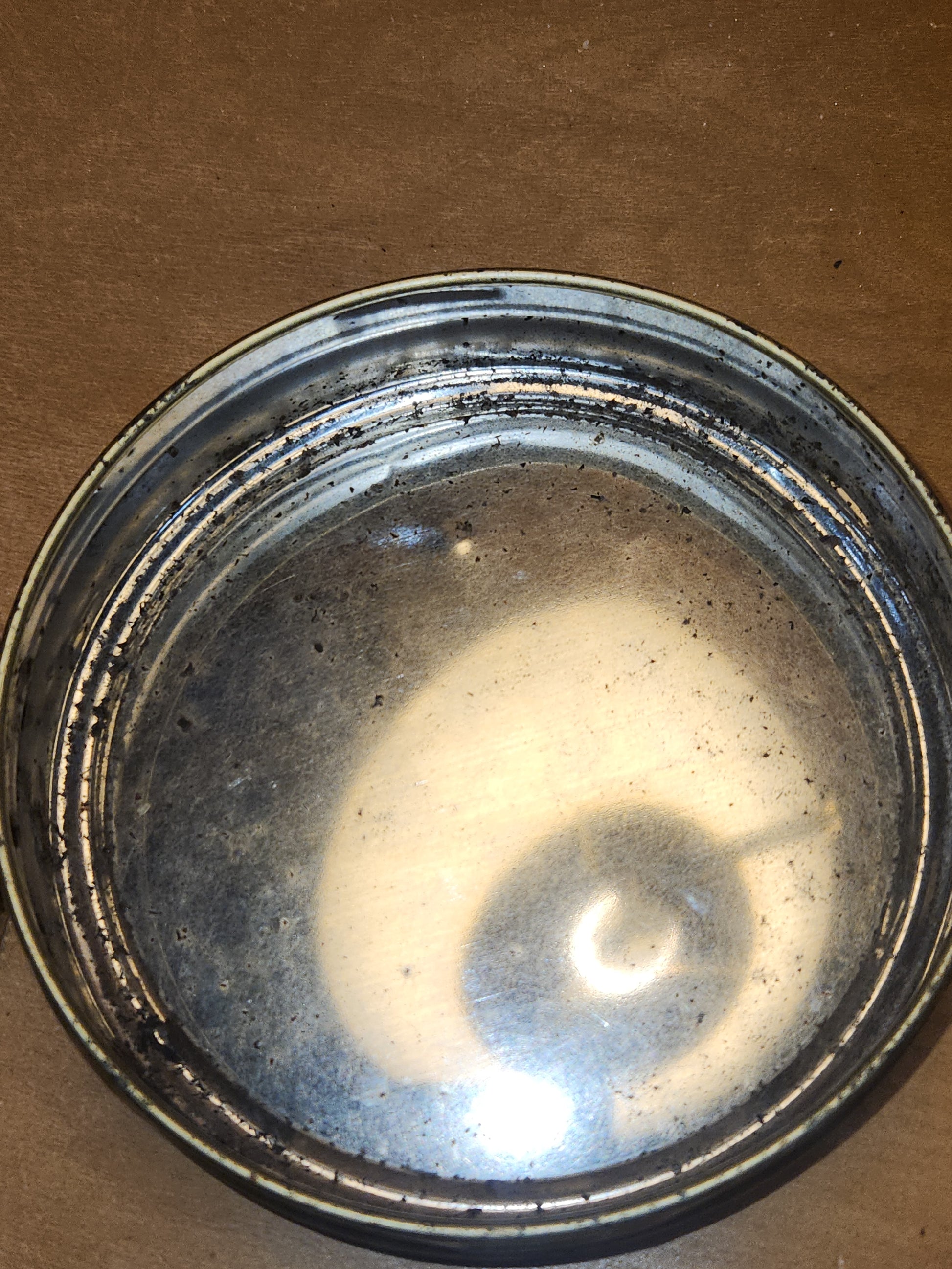 This tin is in good vintage condition. It is a bit over 4 1/2" in diameter and a bit over 1" tall. There is some scratches on the edges of the lid the graphic has a few small scratches also. The bottom half has some scratches with some rust. Please see photos as they are part of the description