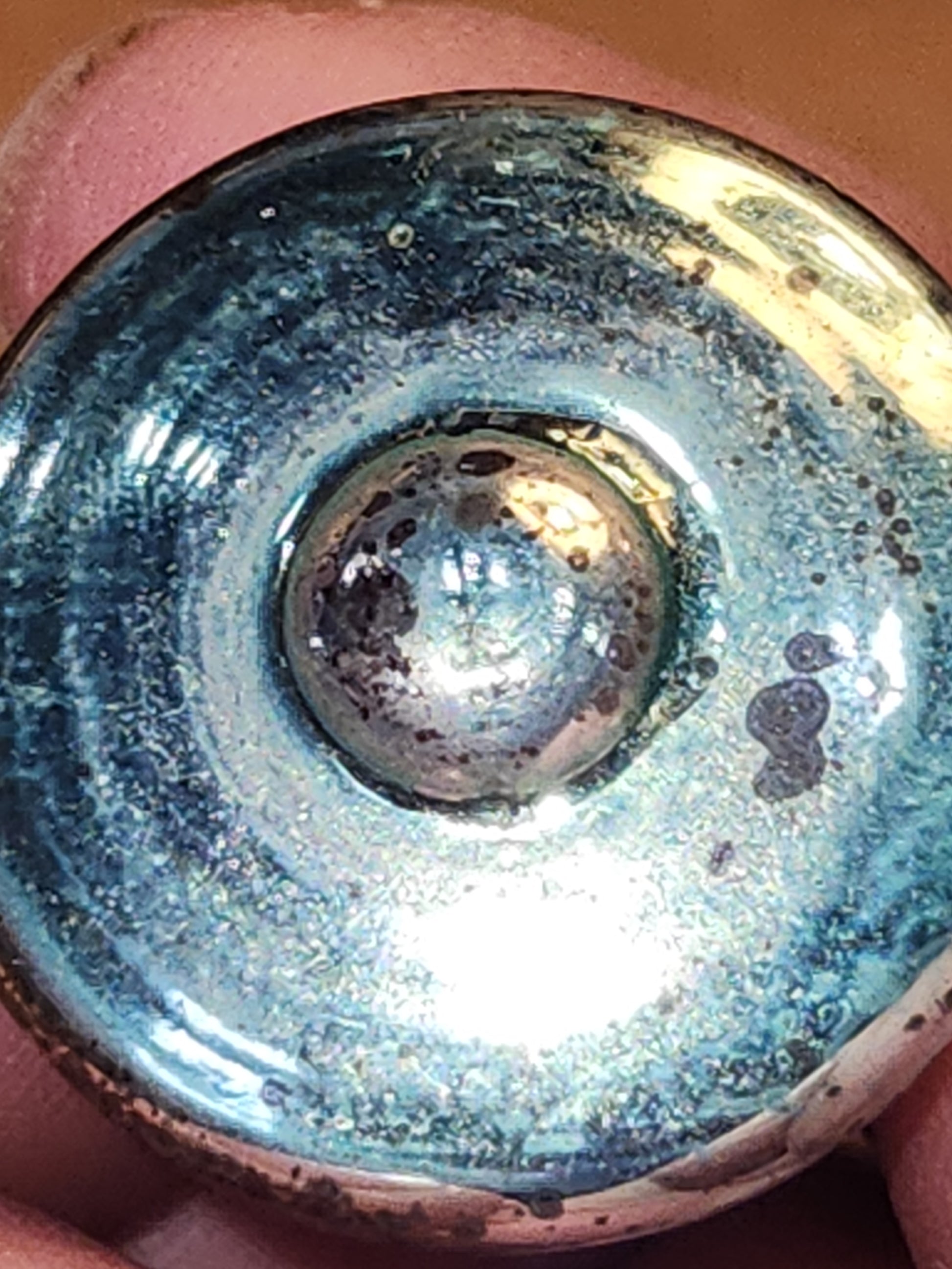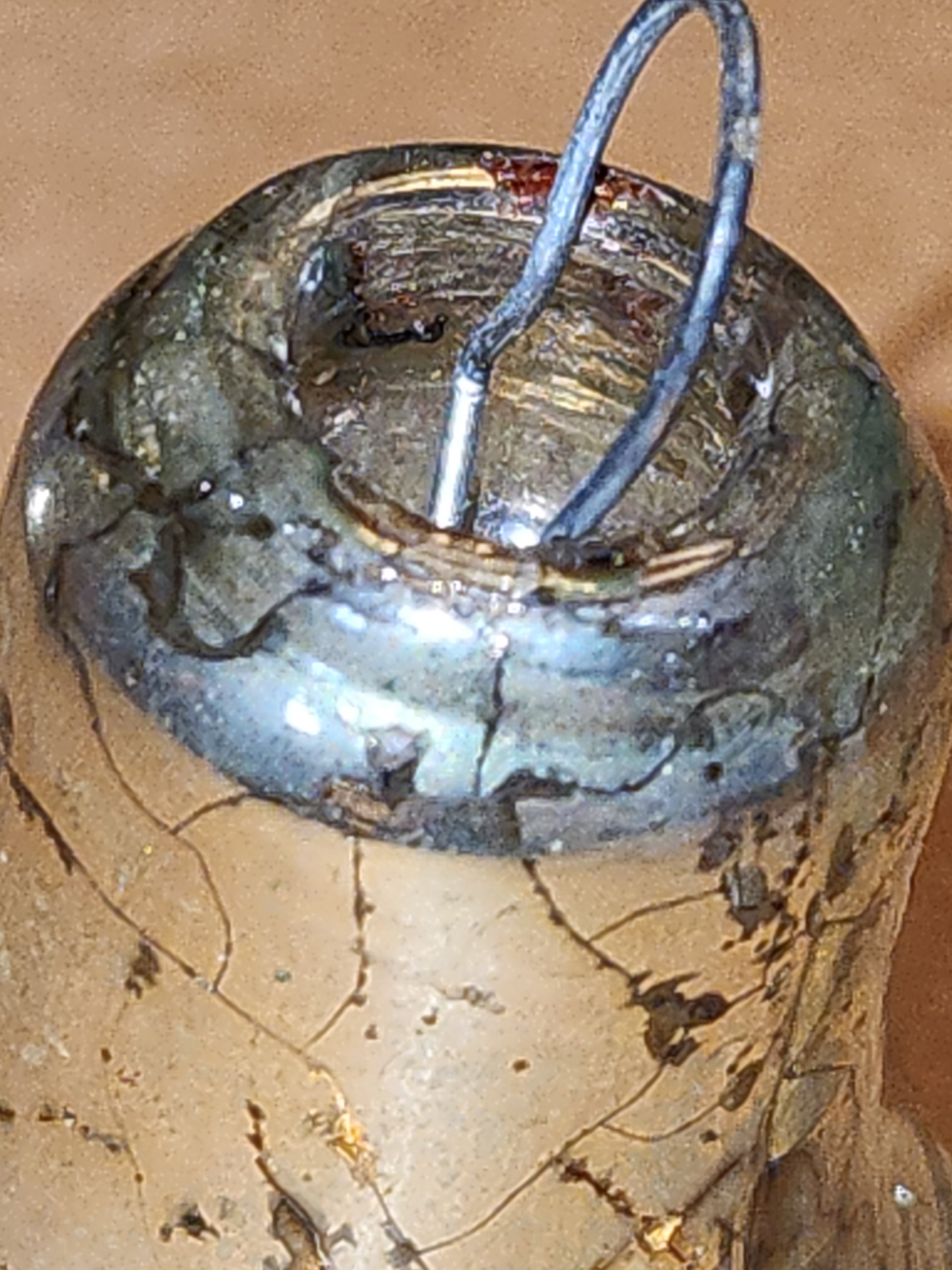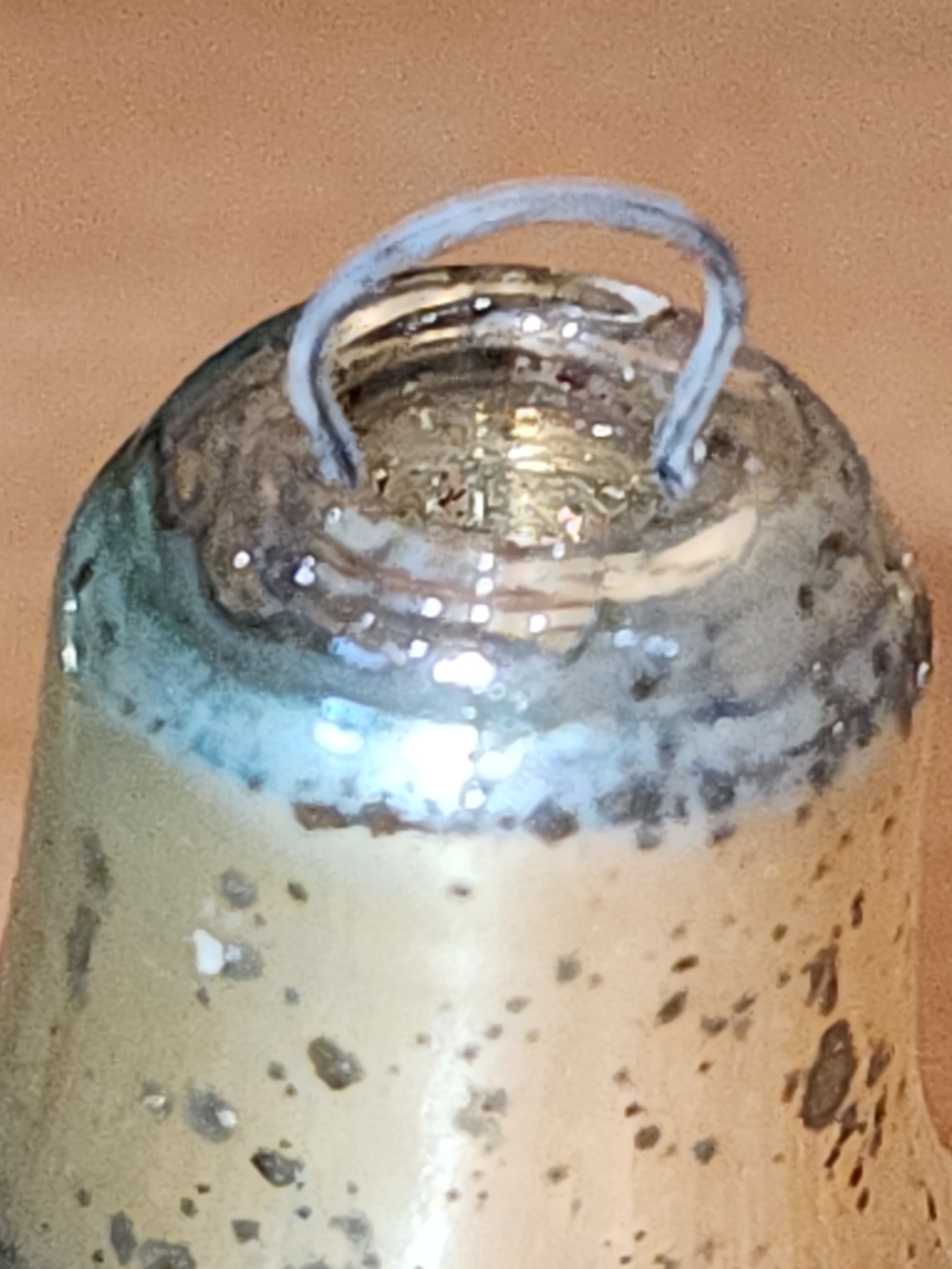 This is a set of 3 vintage mercury glass ornaments. They are unique, they have no top, just a wire hanger from a hole in the top. The ornamenta are 1" tall just to the top of the ornament, not the top of the hanger. When buying vintage ornaments, you may be getting discoloration, paint loss, crazing and ruined boxes, please be aware of this before ordering. Please see photos as they part of the description.