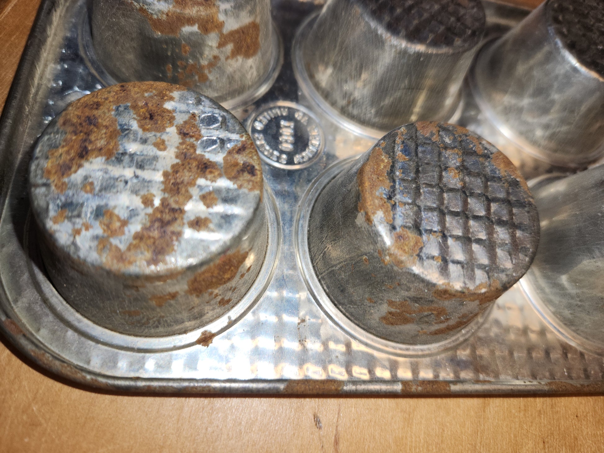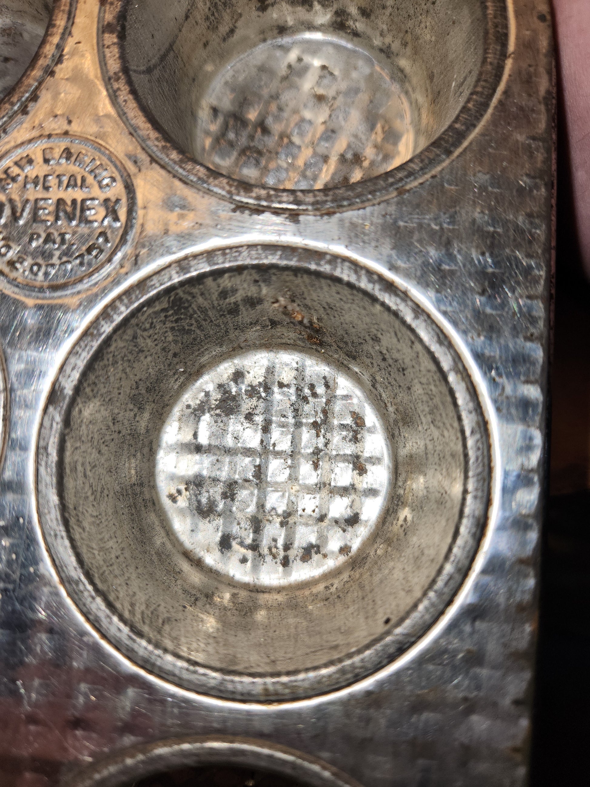 This ovenex muffin pan has lots of patina and discoloration. It also has rust on the bottom. Perfect for decorating a vintage kitchen it is 10" tall 5 1/2" wide. The cups are roughly 2" inside diameter. Please look at the patina and rust in the photos so you know what you will be receiving. Also photos are part of the description