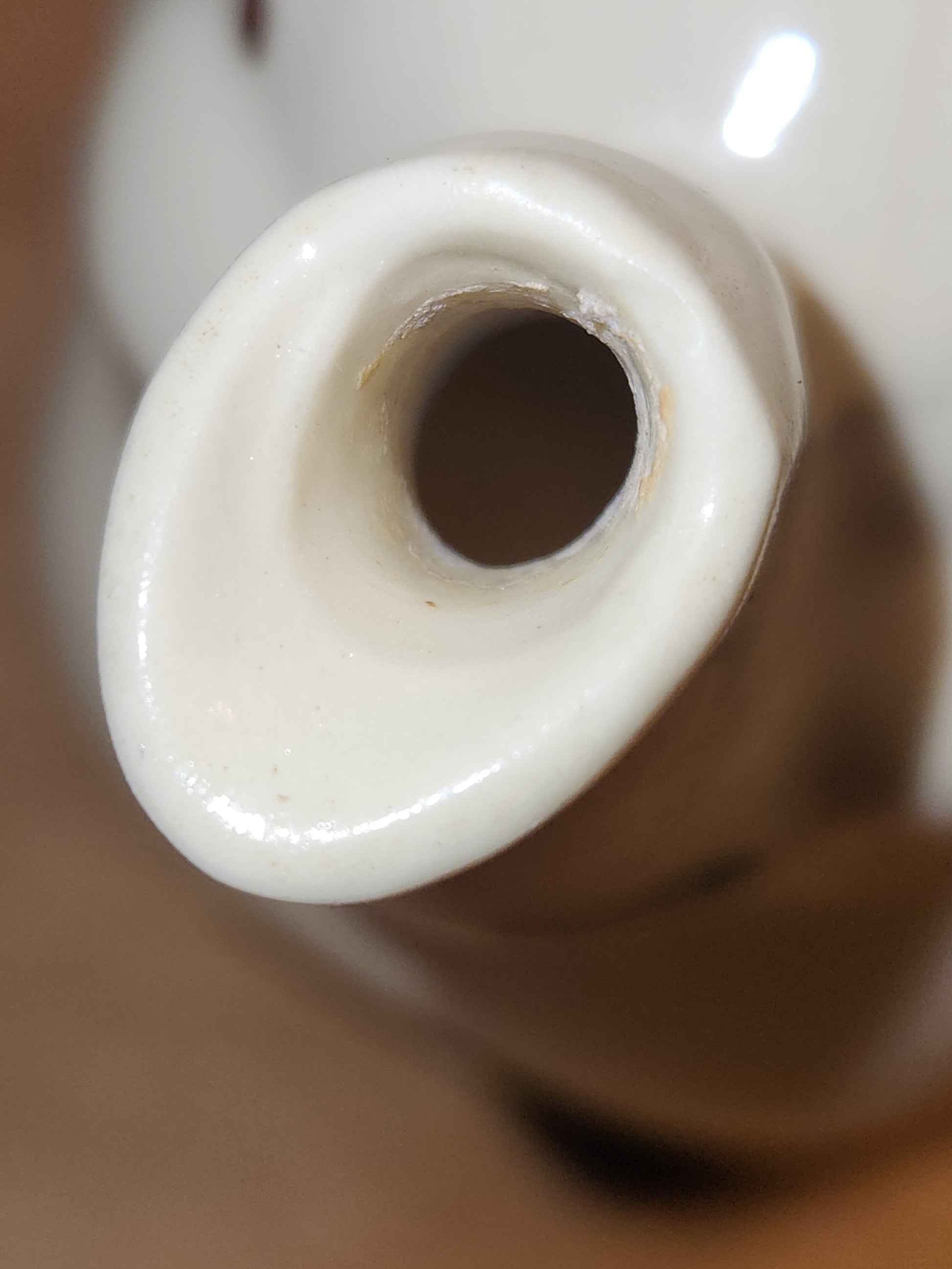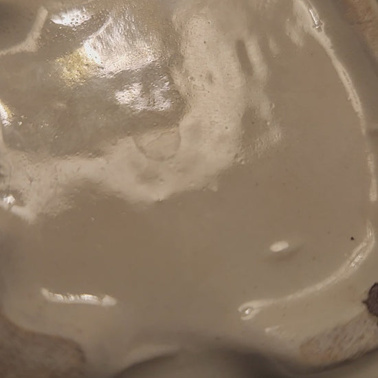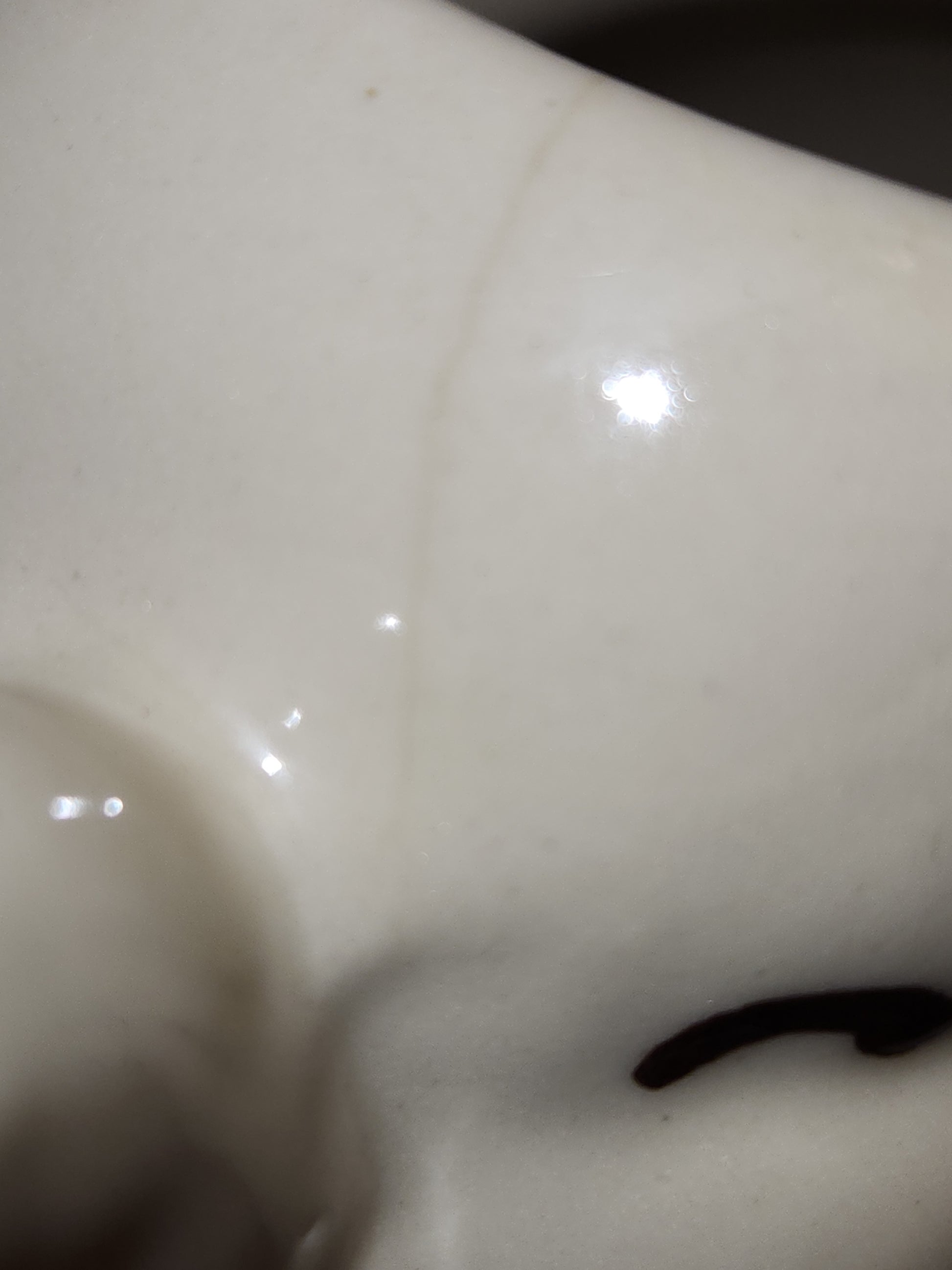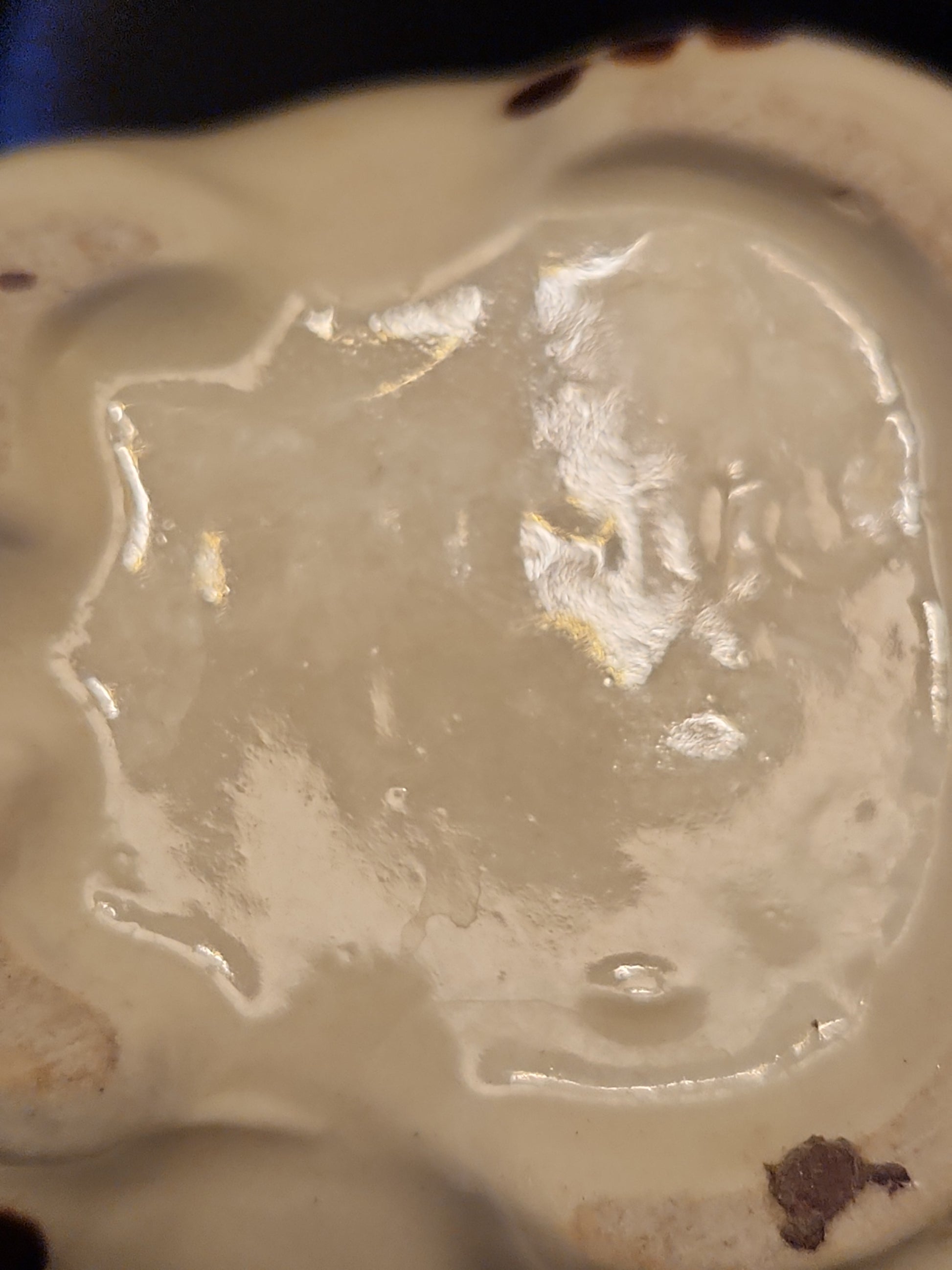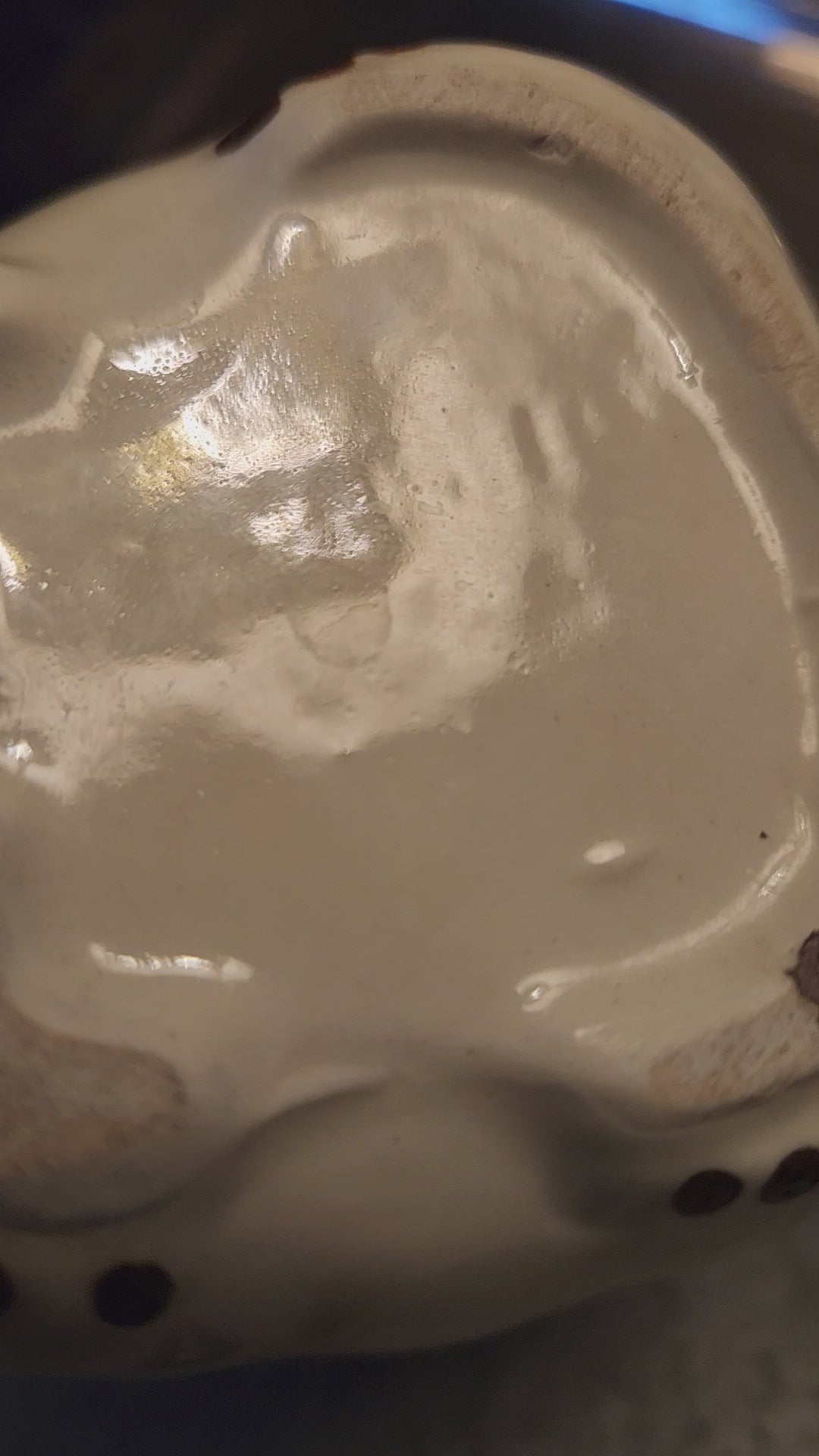 This Creamer is 4 1/2" tall. The bottom is hard to read but I believe it says PATENTED USA. The paint is in good condition. It is a bit crusty dirty underneath the top lip inside and I did not scrub on it or soak it, because It does have a very thin hairline crack from top lip down about 3/4 inch. Please see photos as they are part of the description and show you the crack