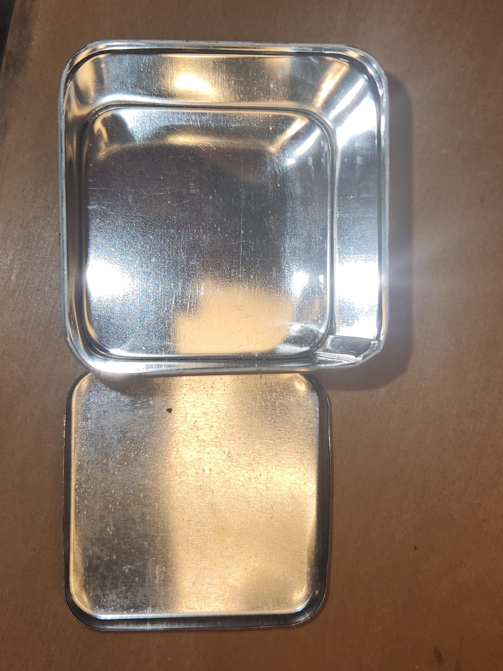 This tin is in fair vintage condition. It has scratches and stains or paint transfer on the lid and some, but less on the sides. It is 2 1/4" tall. Please look at all photos as they are part of the description and show you what you will recieve.